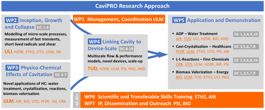 WP5 Thanks to the involvement of all 7 beneficiaries (ULM, TUD, HZDR, UTO, ULJ, AIR and BIO), 2 academic partners (ETHZ, PSI), 5 industry partners (PAQ, PFZR, CRB, AND, and JNJ), and all ten DCs, WP5 will demonstrate the next generation of HC applications for water treatment, cavi-crystallisation, organic reactions and liquid-liquid emulsions. Vigorous exchange of information among WP2 to WP4 will be ensured to help solve any issue encountered and to optimise the functionality of the systems. In addition, questions related to efficiency, costs, and the robustness of the developed systems will be central and discussed with our industrial partners. The structure of the CaviPRO network is designed to achieve our scientific objectives within specified timelines and budgets.