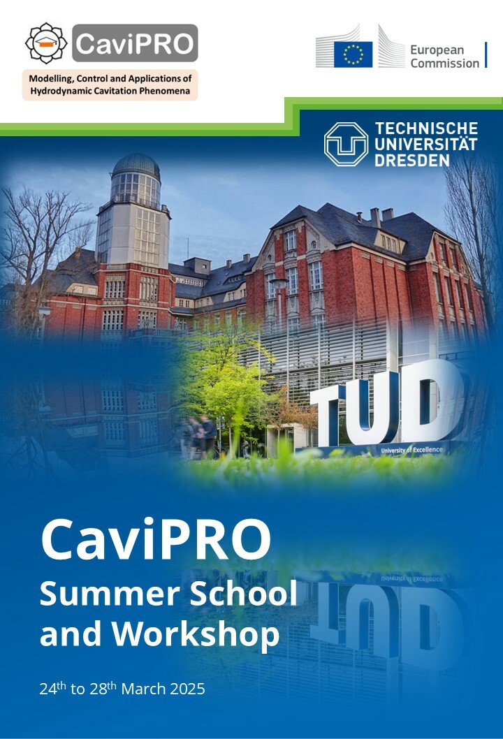The CaviPRO Summer School & Workshop will be held at Technische Universität Dresden from March 24th to 28th, 2025, bringing together CaviPRO DCs for an engaging week of learning and collaboration. The program includes DC progress reports, expert-led training sessions, lab visits, and industry insights. Participants will attend a special session with the EU Project Officer, explore cutting-edge hydrodynamic cavitation (HC) devices and 3D printing at the Fraunhofer Additive Manufacturing Center, and take part in team-building activities and topical discussions. Training sessions will cover project management, science communication, and networking, while a hands-on lab visit at HZDR will provide experience in flow analysis and tomographic imaging.
